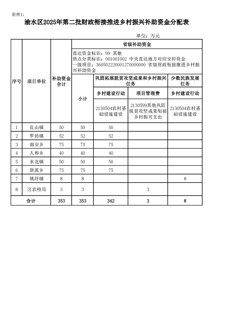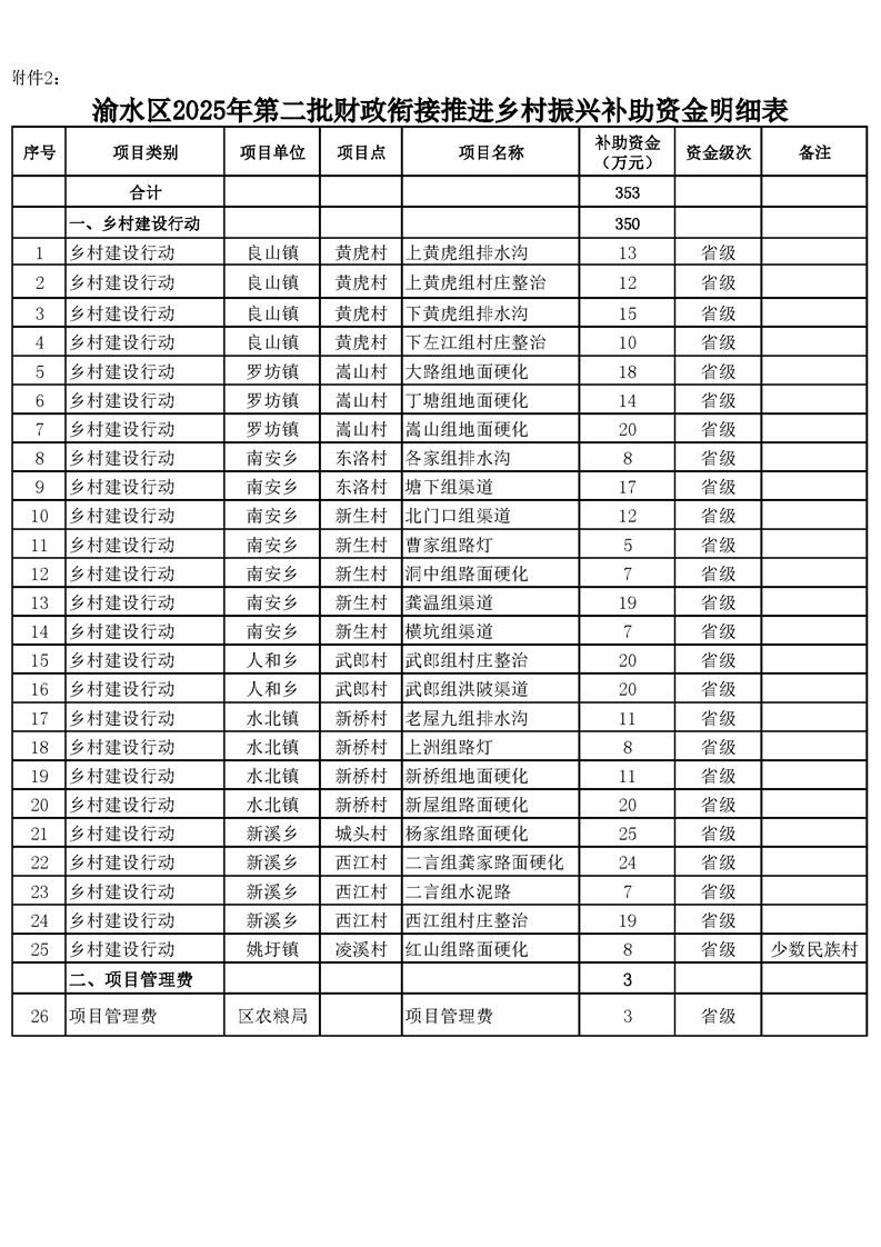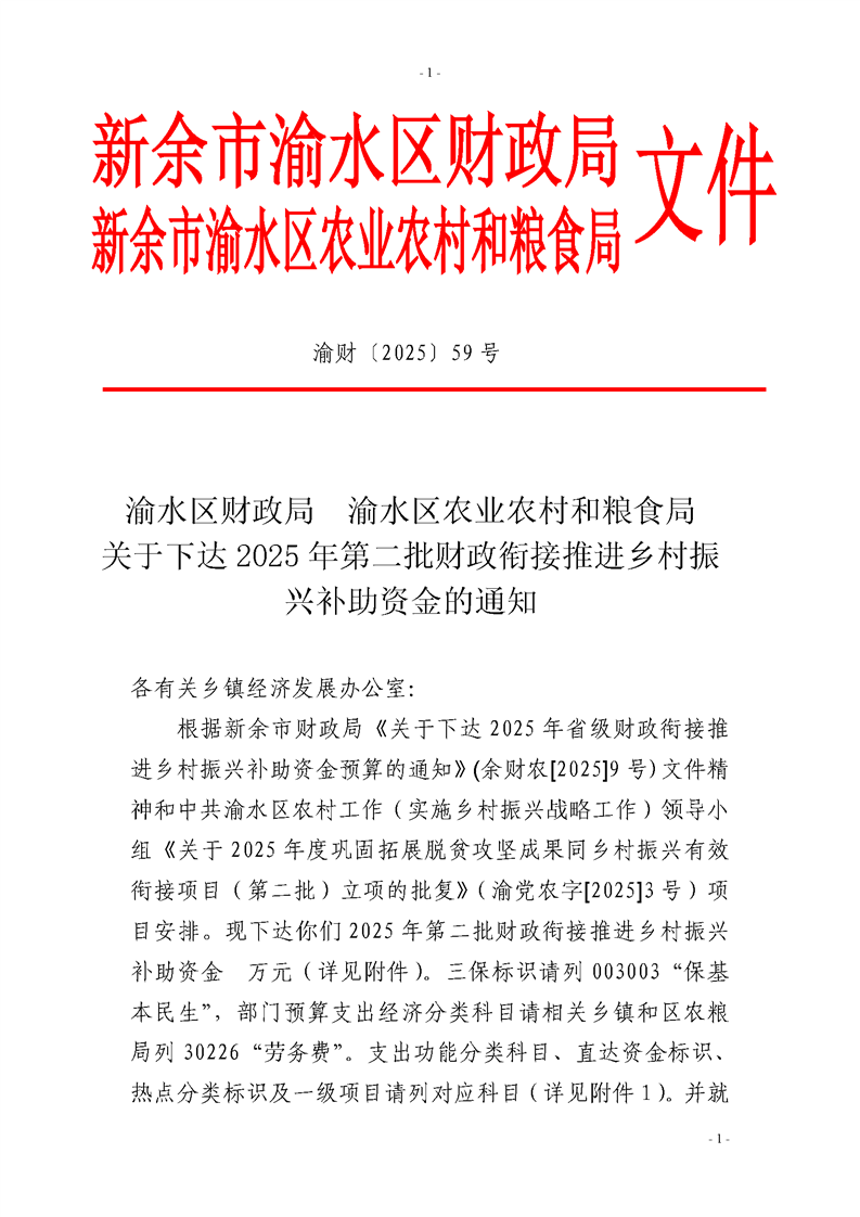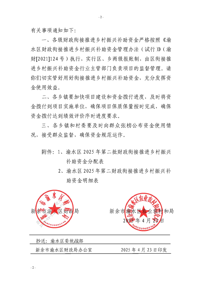 渝水區2025年第二批財政銜接推進鄉村振興補助資金分配計劃
