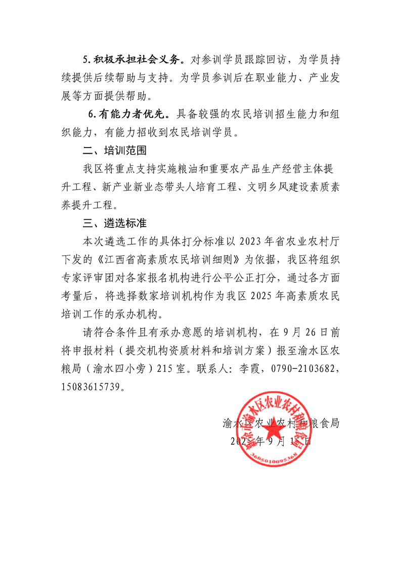 關于公開遴選2025年渝水區高素質農民培訓承辦機構的公告
