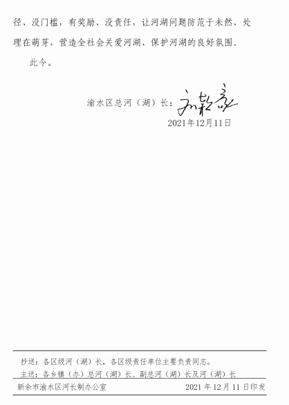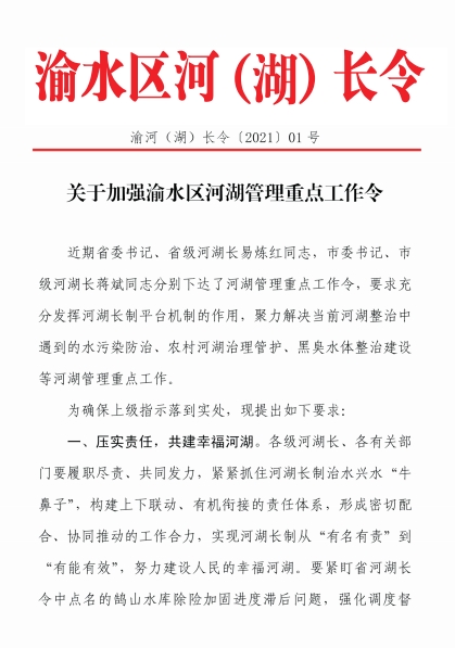 渝河(湖)長(zhǎng)令01號(hào) 關(guān)于加強(qiáng)渝水區(qū)河湖管理重點(diǎn)工作令