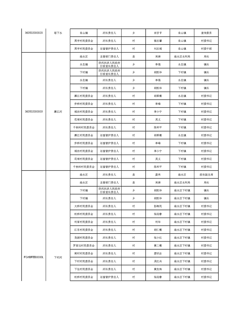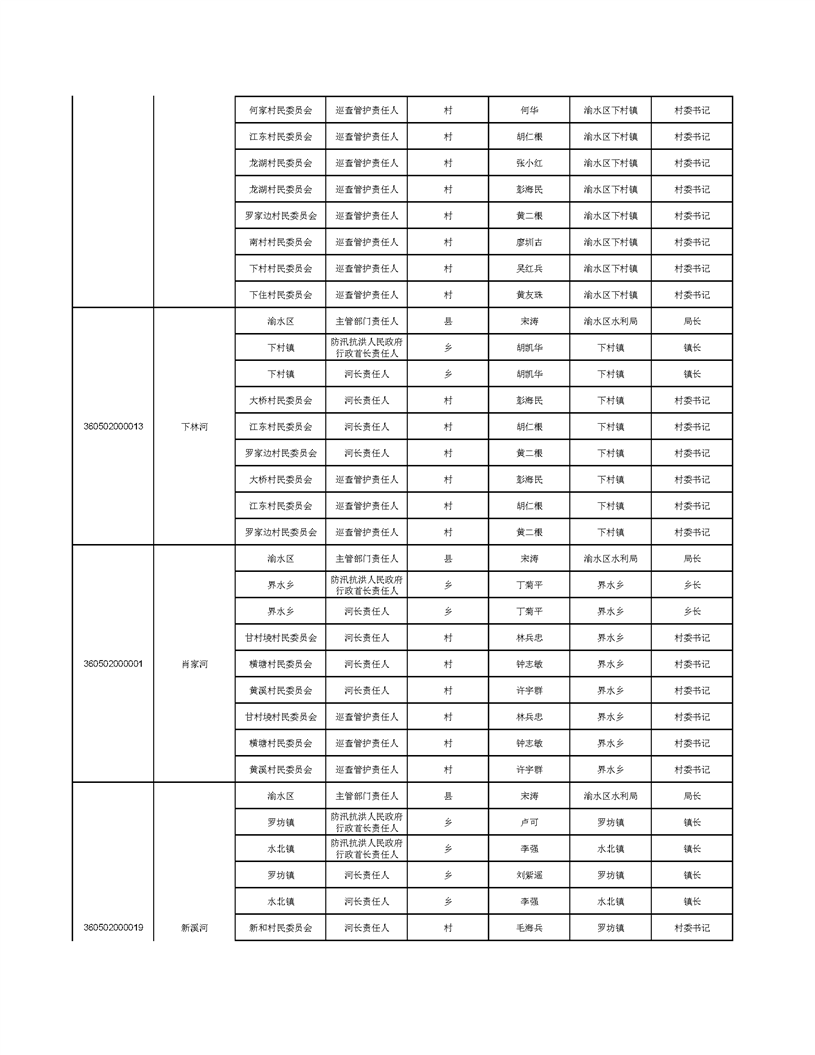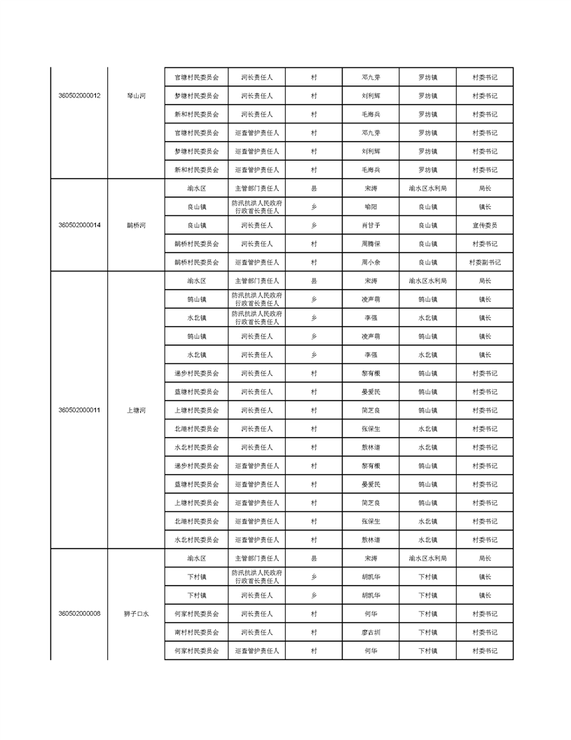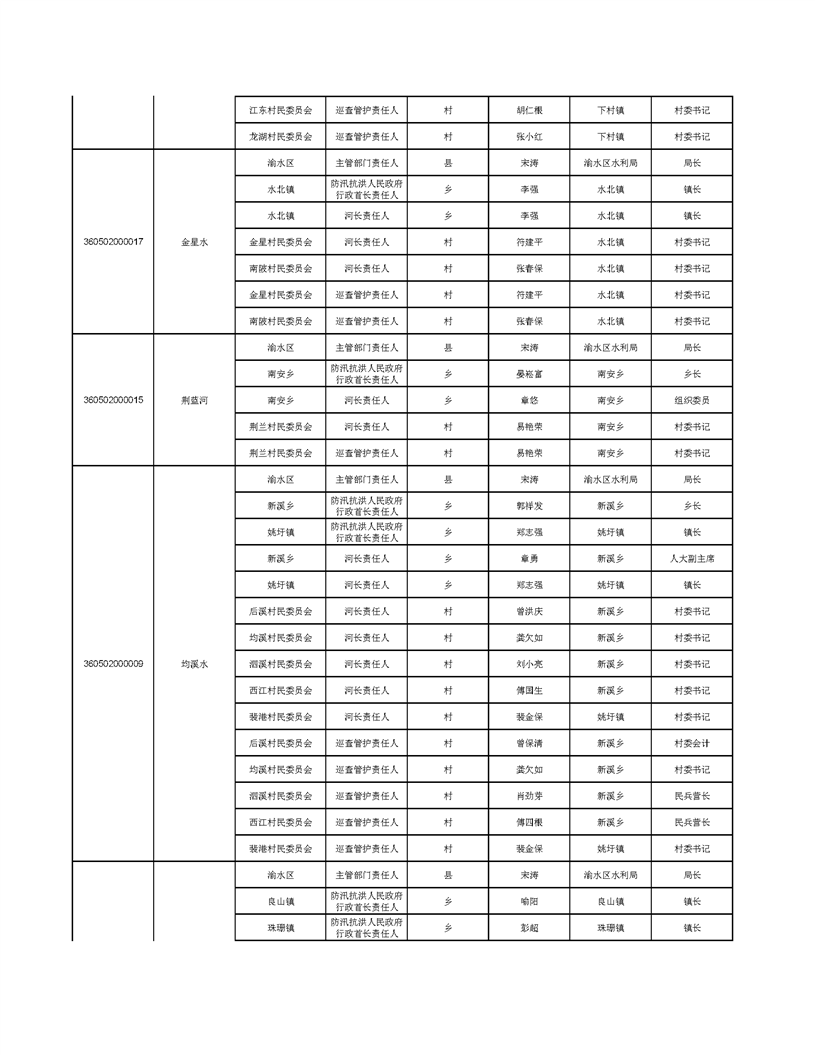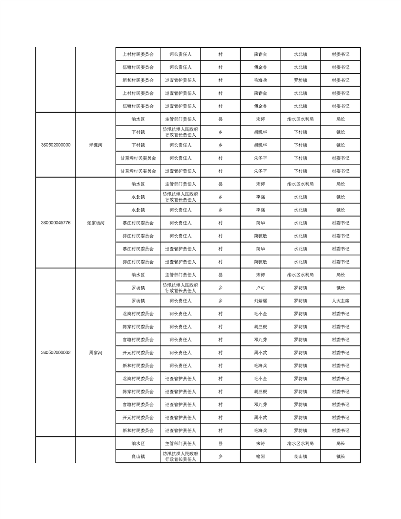 新余市渝水區流域面積200km2及以下山區河流責任人名單公示