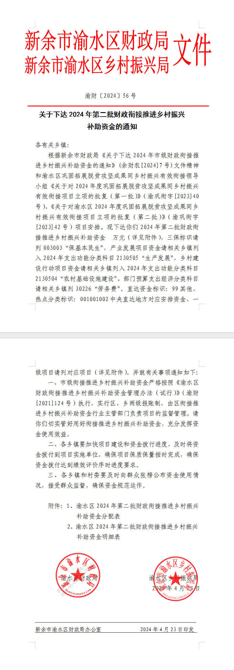 附件2:渝水區2024年第二批銜接推進鄉村振興補助資金明細表