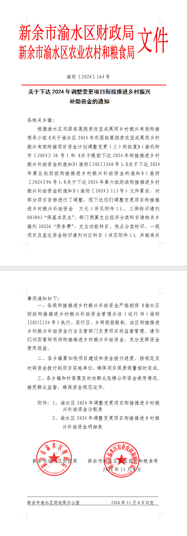 附件1:渝水區2024年調整變更項目銜接推進鄉村振興補助資金分配表