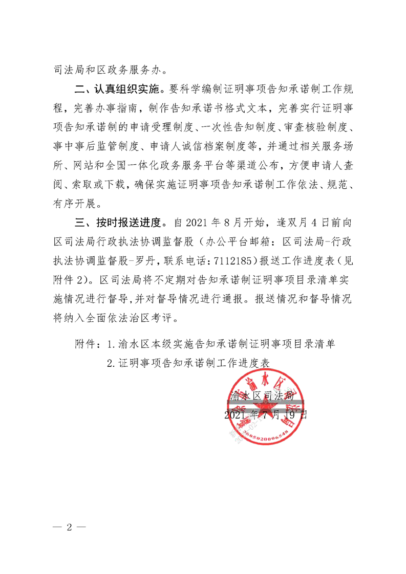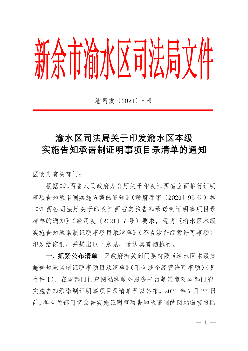 (有效)--渝司發〔2021〕8號 渝水區司法局關于印發渝水區本級實施告知承諾制證明事項目錄清單的通知