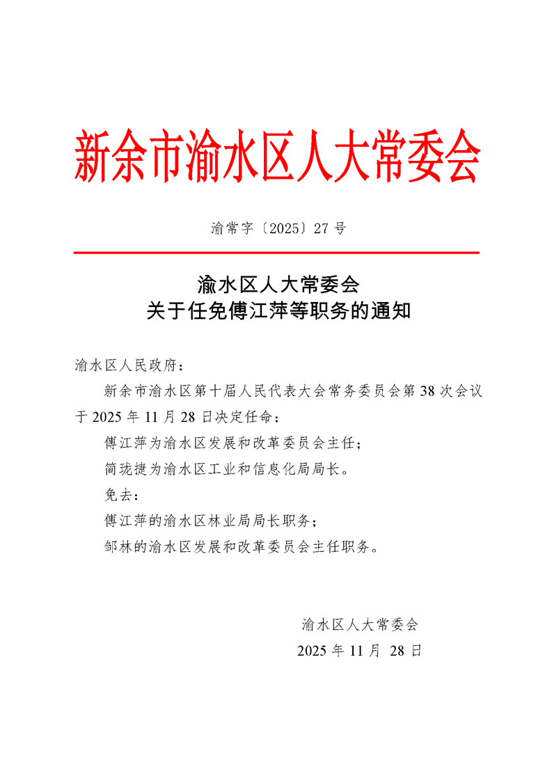 渝水區人大常委會關于任免傅江萍等職務的通知