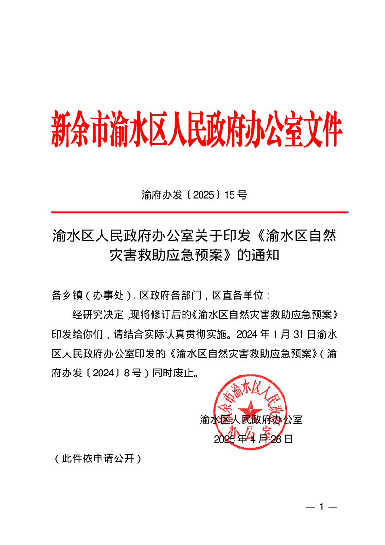 渝水區(qū)人民政府辦公室關(guān)于印發(fā) 《渝水區(qū)自然災害救助應急預案》的通知