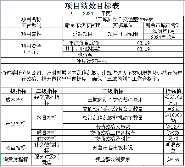 2024年實(shí)行績(jī)效目標(biāo)管理的項(xiàng)目4個(gè),(部門(mén)預(yù)算中50萬(wàn)元以上的,且進(jìn)行了績(jī)效評(píng)審的項(xiàng)目1個(gè),“三城同創(chuàng)”交通整治經(jīng)費(fèi),涉及資金63.09萬(wàn)元。