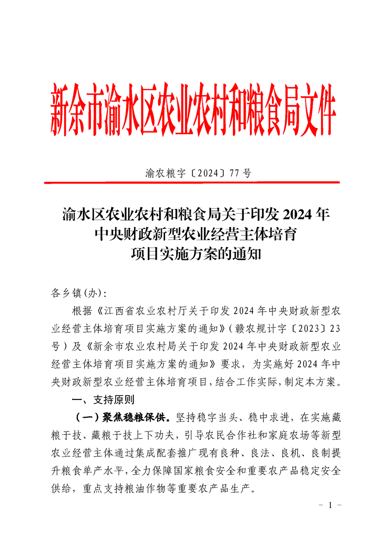 渝水區(qū)農(nóng)業(yè)農(nóng)村和糧食局關(guān)于印發(fā)2024年中央財(cái)政新型農(nóng)業(yè)經(jīng)營(yíng)主體培育項(xiàng)目實(shí)施方案的通知