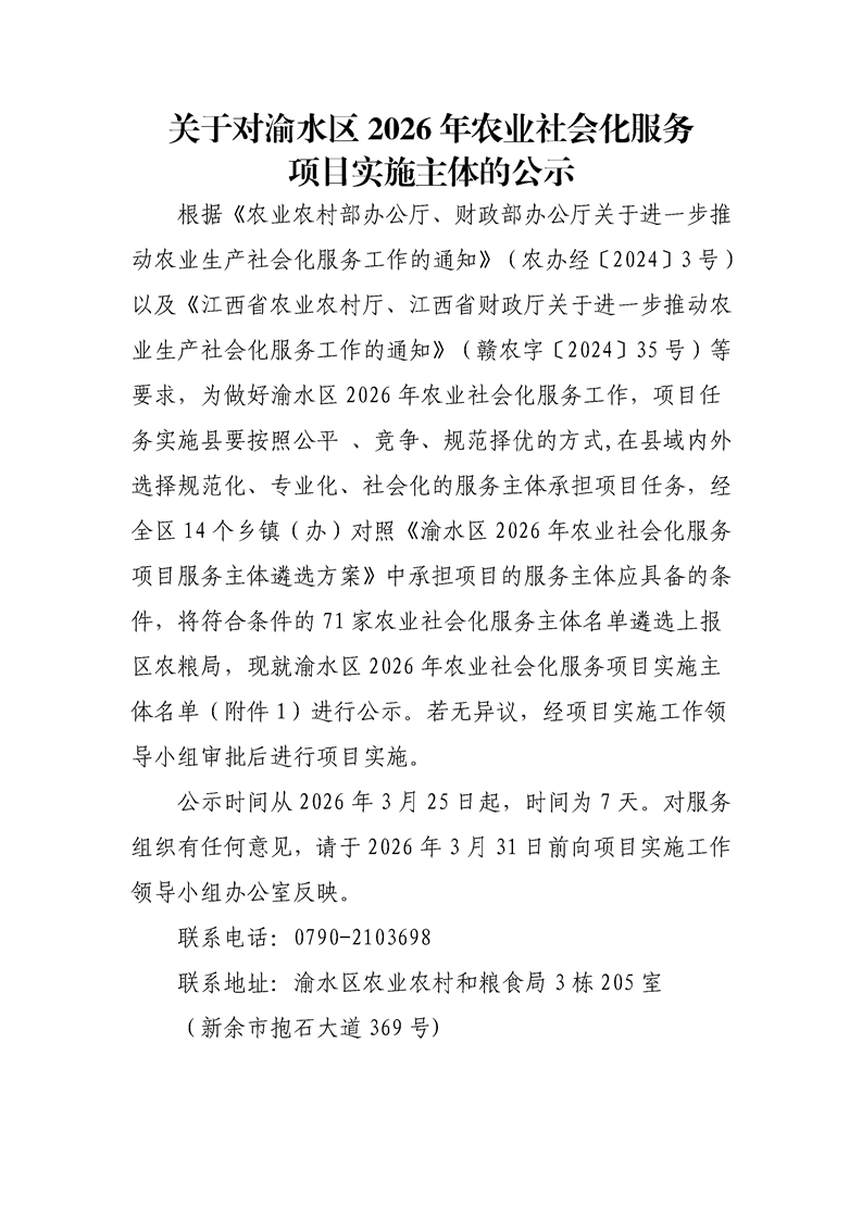 關(guān)于對(duì)渝水區(qū)2026年農(nóng)業(yè)社會(huì)化服務(wù)項(xiàng)目實(shí)施主體的公示