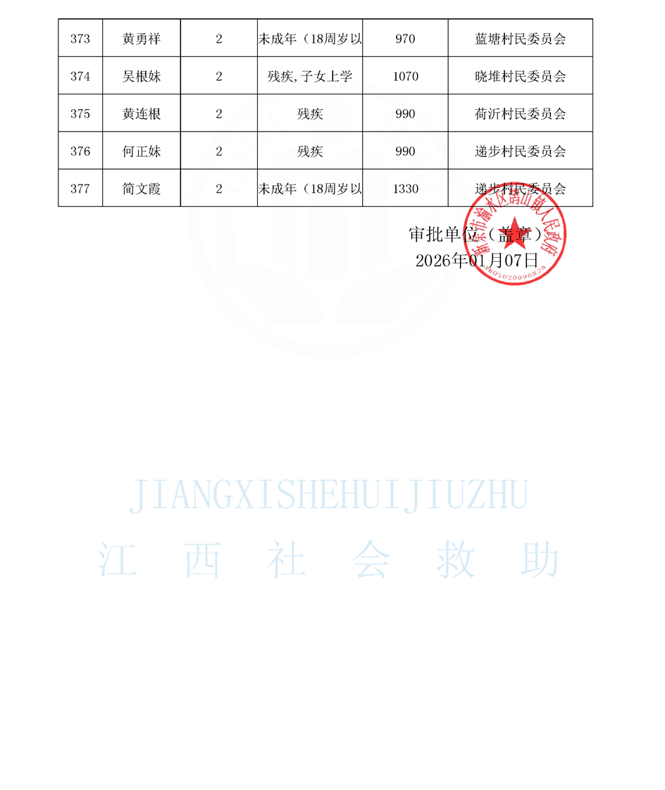 鵠山鎮2026年1月最低生活保障對象公布名單
