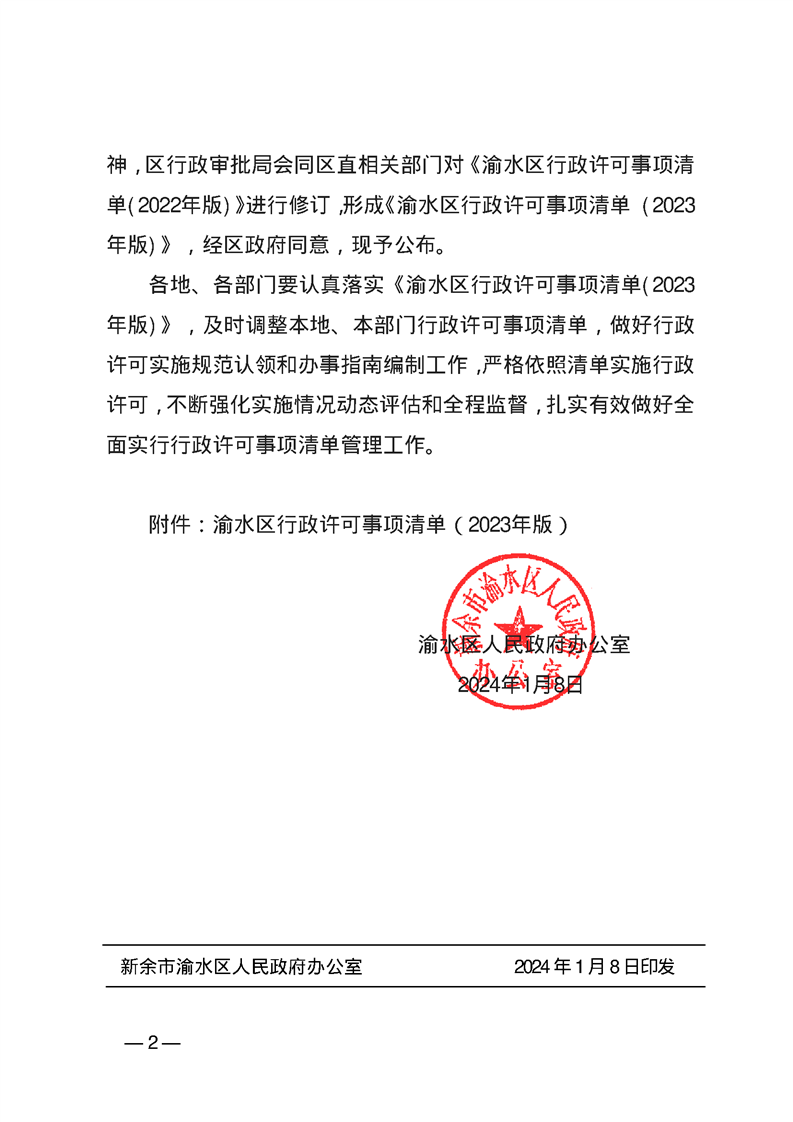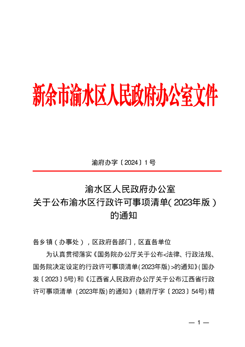 渝府辦字〔2024〕1號渝水區人民政府辦公室關于公布《渝水區行政許可事項清單(2023年版)》的通知