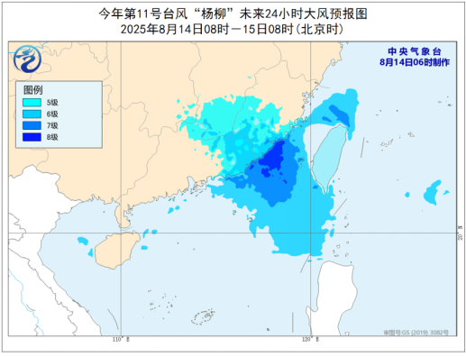 大風預報:8月14日,東海南部、臺灣海峽、南海東北部、巴士海峽、臺灣島北部和南部沿海、福建中南部及沿海、廣東東部及沿海、江西南部將有5~7級風,其中福建南部沿海、廣東東部沿海、臺灣海峽南部海域風力可達8級、陣風9~10級(見圖2)。