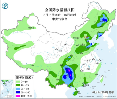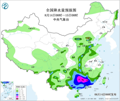 圖3 全國降水量預報圖(8月14日08時—15日08時)