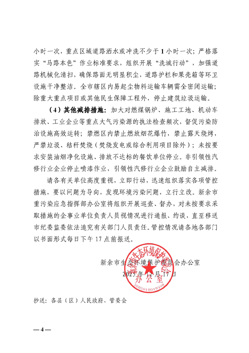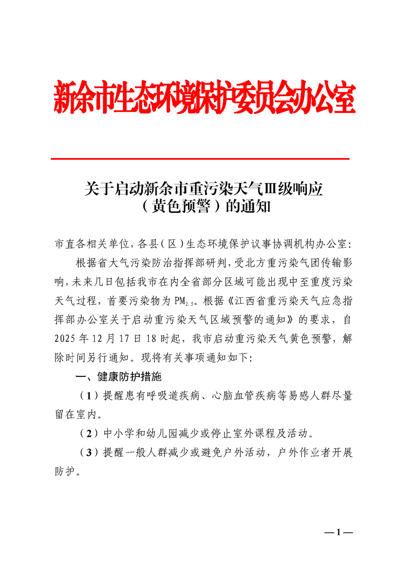 新余市重污染天氣Ⅲ級響應(黃色預警)