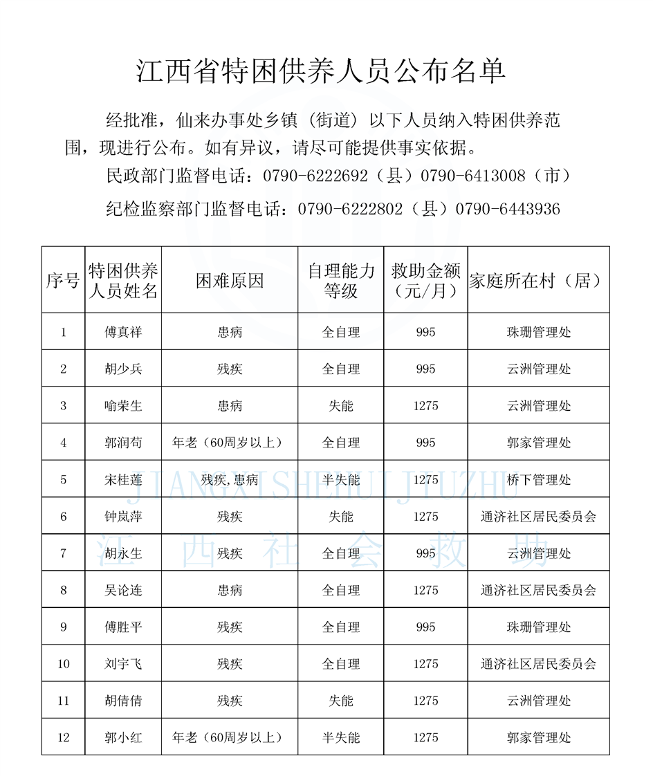 仙來辦特困供養人員公布名單