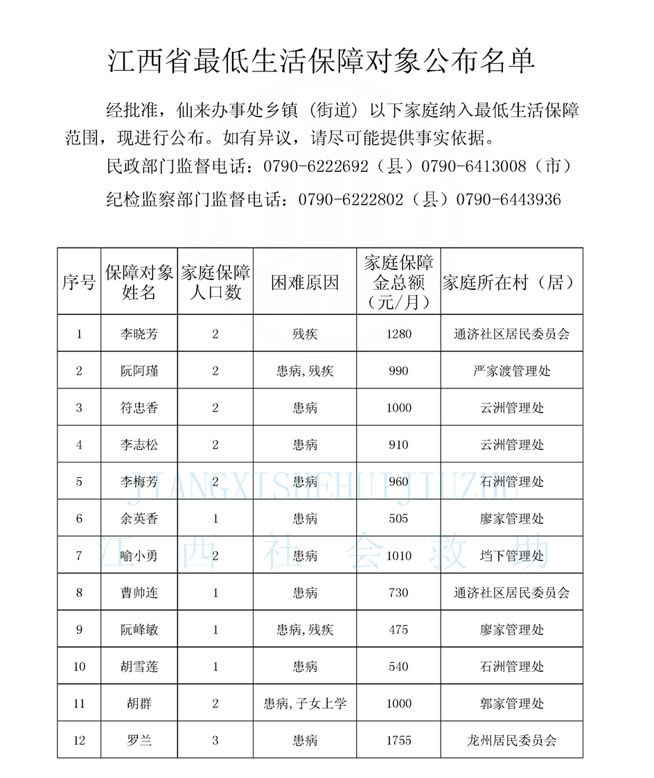 仙來辦最低生活保障對象公布名單