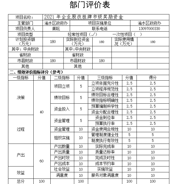 組織對“2021年企業股改掛牌市級獎勵資金”1個項目開展了部門評價,涉及一般公共預算支出180萬元,政府性基金預算支出0萬元,國有資本預算支出0萬元。從評價情況來看,促進企業股改上市掛牌進度,獎勵股改掛牌企業2家,及時兌付企業獎勵資金180萬元,提升受惠企業滿意度,優化全區營商環境。綜合評價結果良好,評價結論100分。