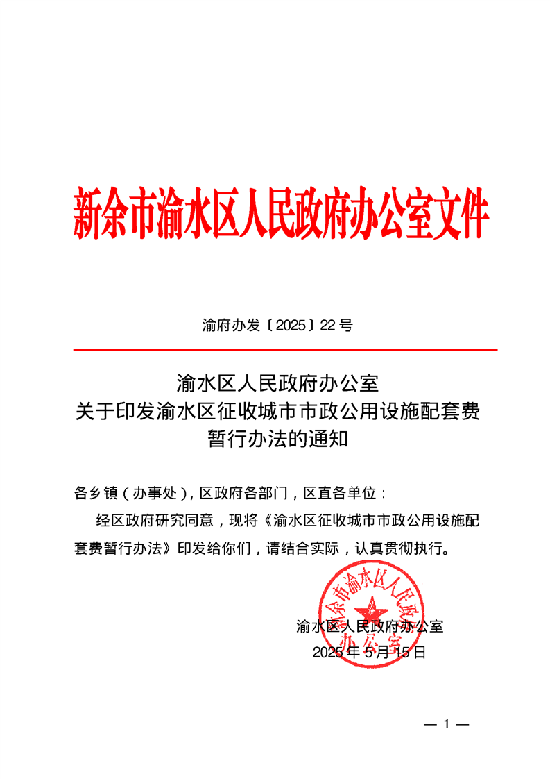 渝府辦發(fā)【2025】22號-渝水區(qū)人民政府辦公室關(guān)于印發(fā)渝水區(qū)征收城市市政公用設(shè)施配套費(fèi)暫行辦法的通知