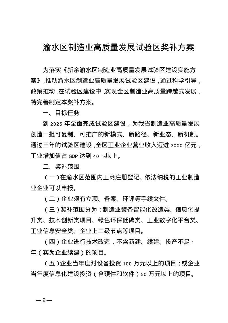 渝府發〔2023〕2號 渝水區人民政府關于印發渝水區制造業高質量發展試驗區獎補方案的通知
