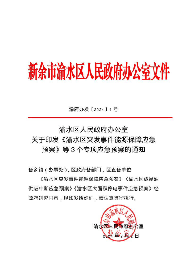 渝府辦發(fā)【2024】4號 渝水區(qū)人民政府辦公室關(guān)于印發(fā)《渝水區(qū)突發(fā)事件能源保障應(yīng)急預(yù)案》等3個專項應(yīng)急預(yù)案的通知