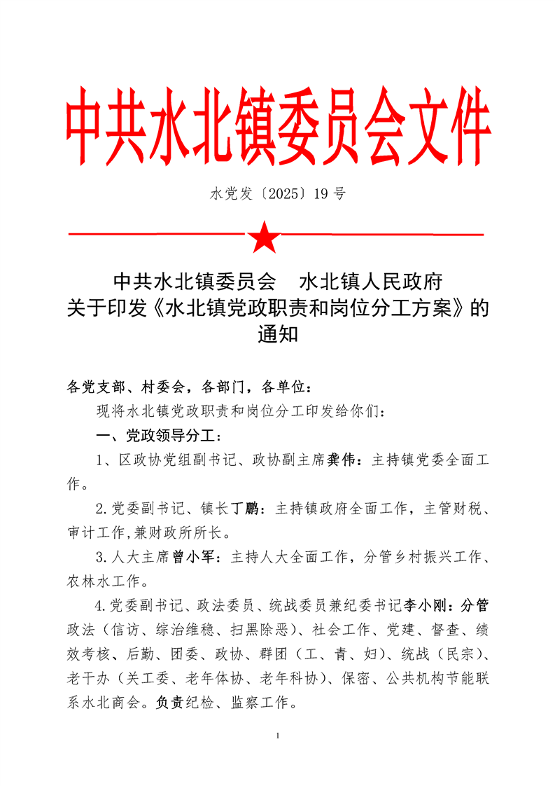 水黨發19號關于印發《水北鎮黨政職責和崗位分工方案》的通知