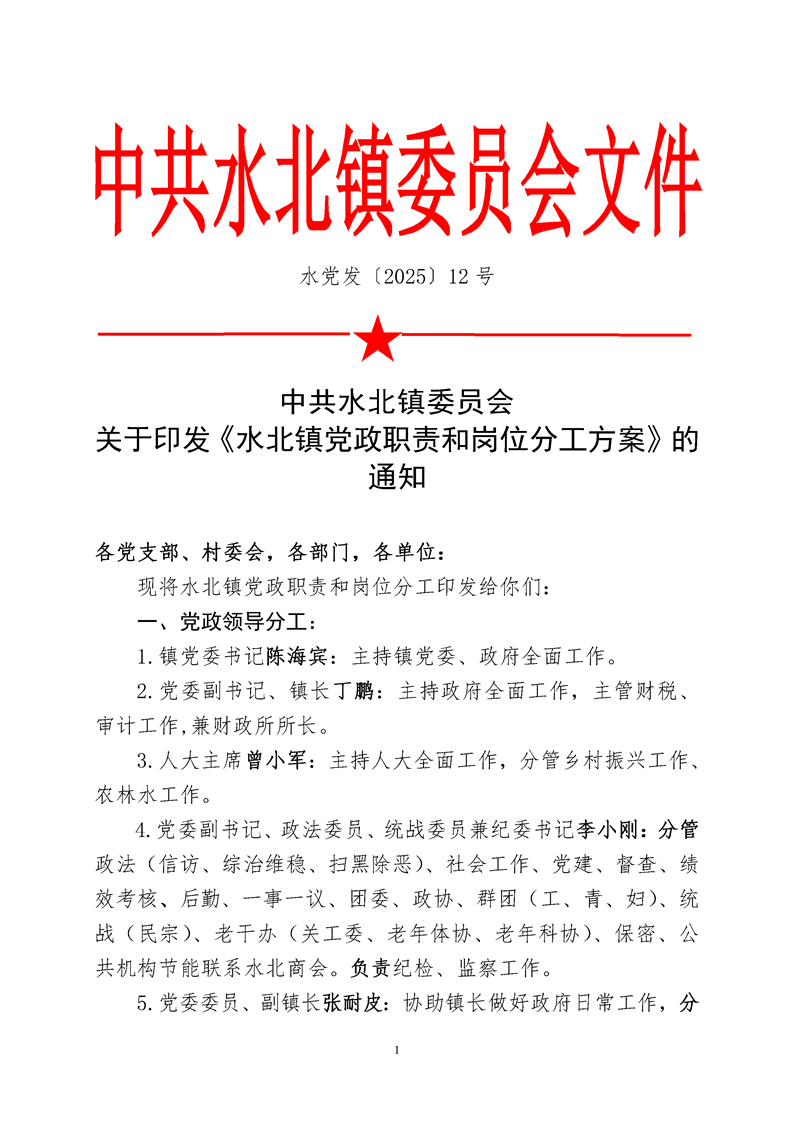 水黨發(fā)12號關于印發(fā)《水北鎮(zhèn)黨政職責和崗位分工方案》的通知