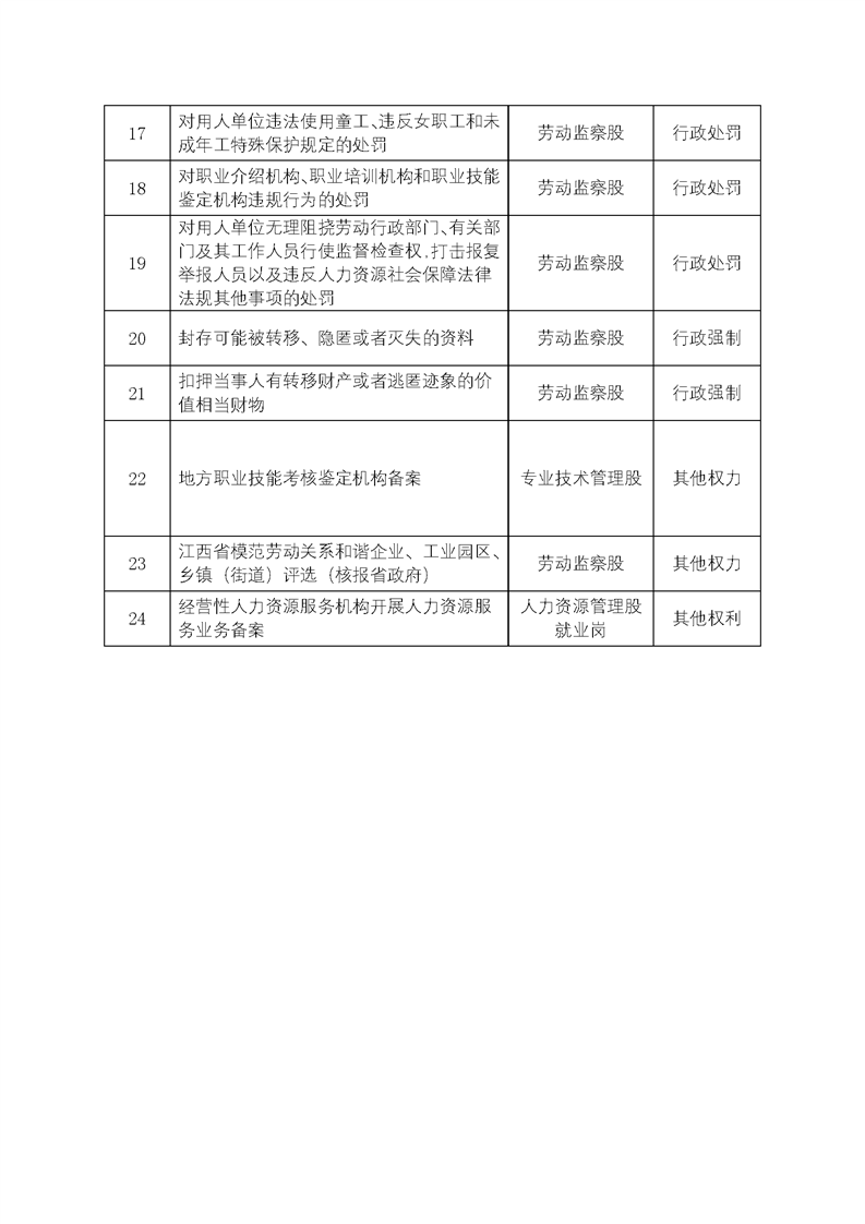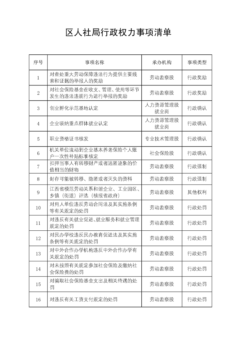 渝水區人社局行政權力事項清單