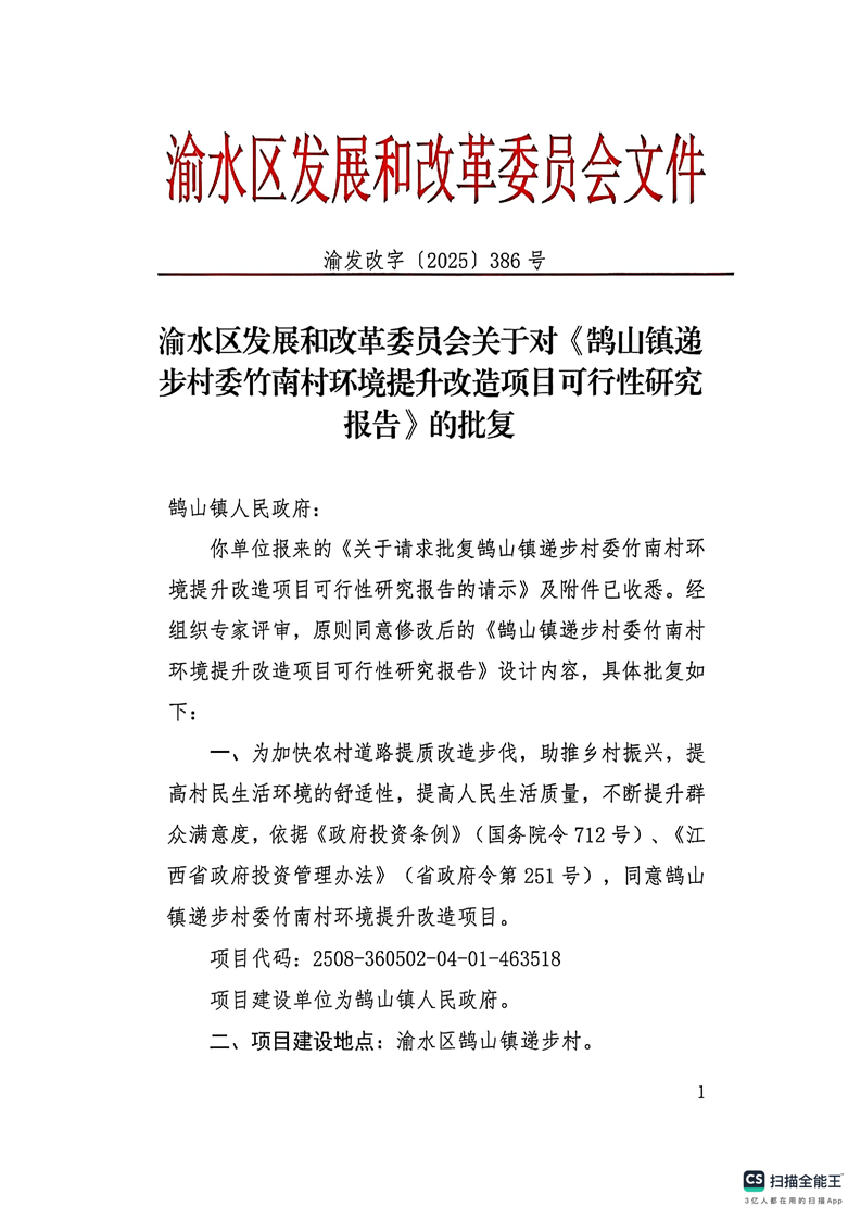 鵠山鎮遞步村委竹南村環境提升改造項目批復