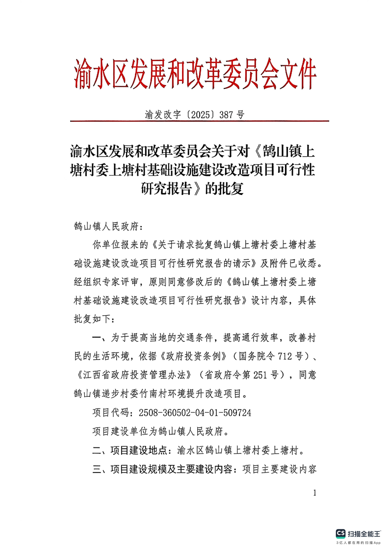 鵠山鎮(zhèn)上塘村委上塘村基礎(chǔ)設(shè)施建設(shè)改造項(xiàng)目批復(fù)