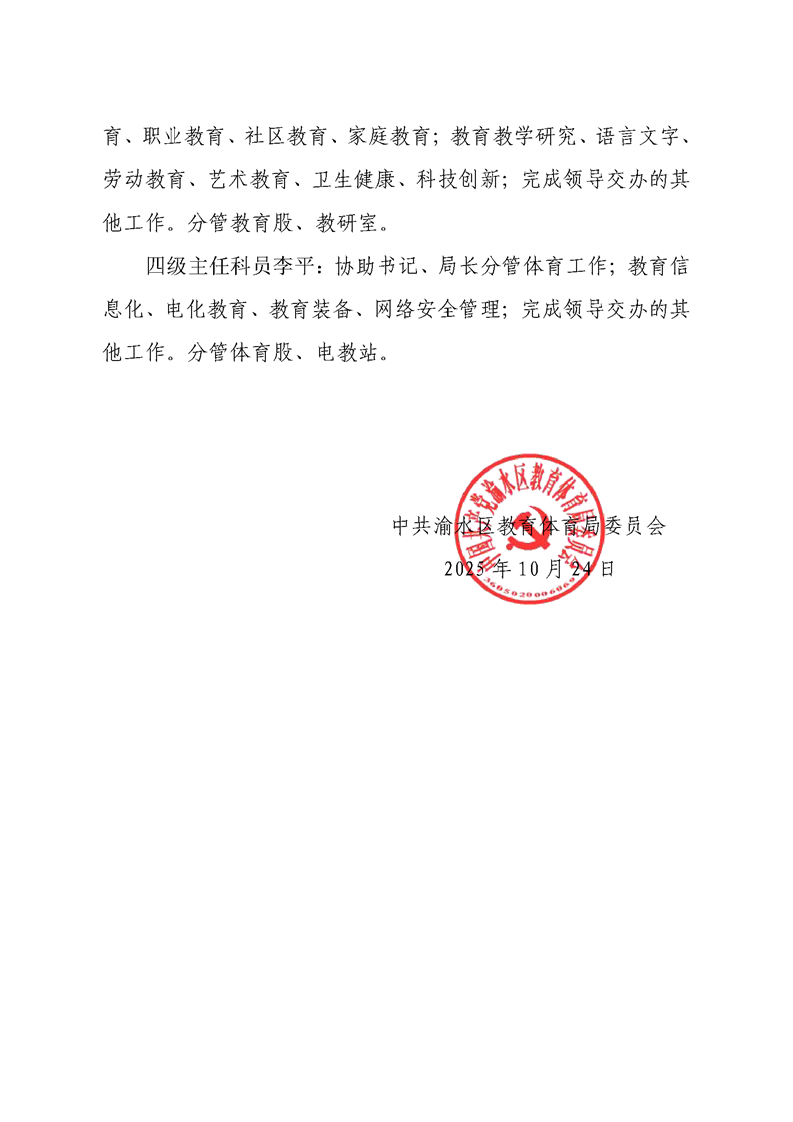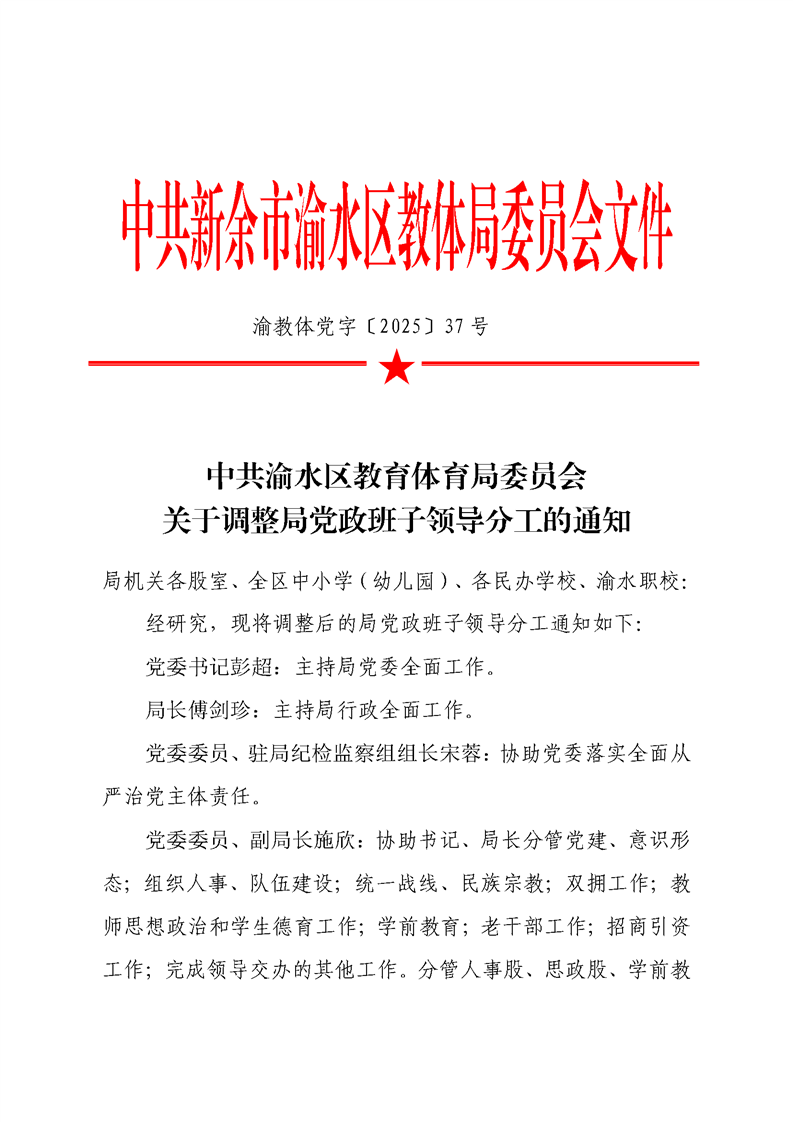 中共渝水區(qū)教體局委員會(huì)關(guān)于局黨政班子領(lǐng)導(dǎo)和機(jī)關(guān)工作人員分工的通知
