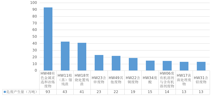 全省危險(xiǎn)廢物產(chǎn)生類別涉及《國家危險(xiǎn)廢物名錄》中的41類,產(chǎn)生量前十的危險(xiǎn)廢物類別約占全省危險(xiǎn)廢物產(chǎn)生量的91%。