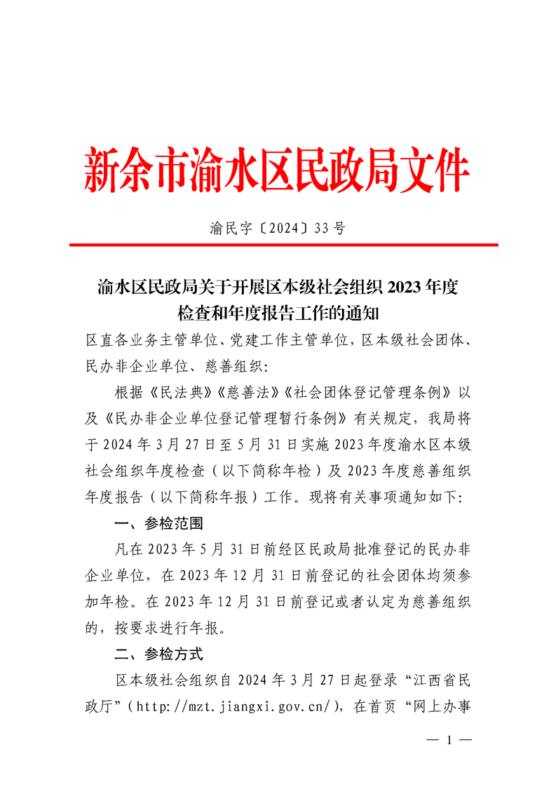 渝水區民政局關于開展區本級社會組織2023年度檢查和年度報告工作的通知