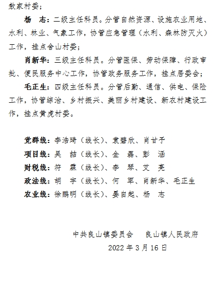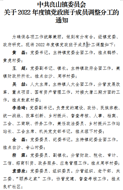 中共良山鎮委員會關于2022年度鎮黨政班子成員調整分工的通知