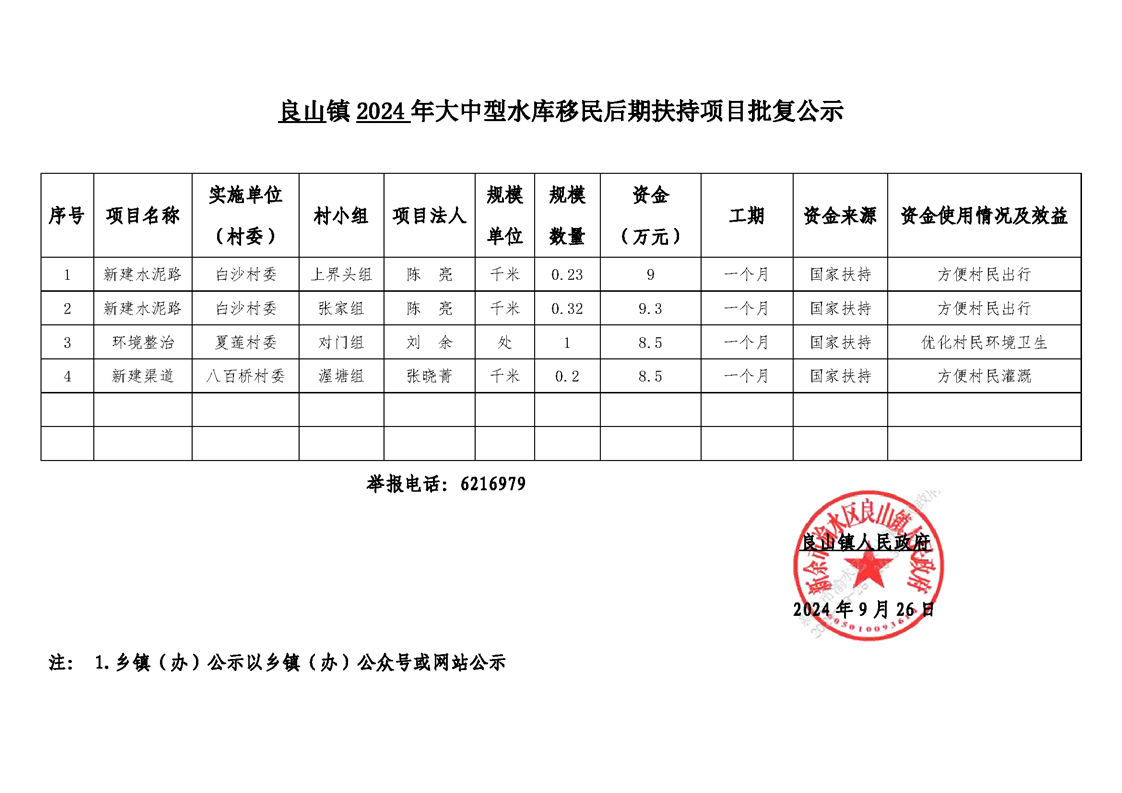 良山鎮2024年大中型水庫移民后期扶持項目批復公示
