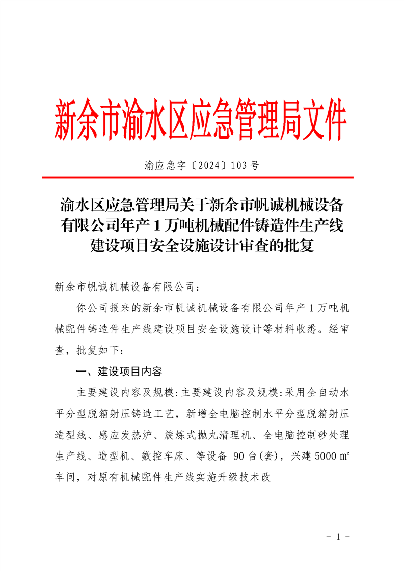 渝水區應急管理局關于新余市帆誠機械設備有限公司年產1萬噸機械配件鑄造件生產線建設項目安全設施設計審查的批復