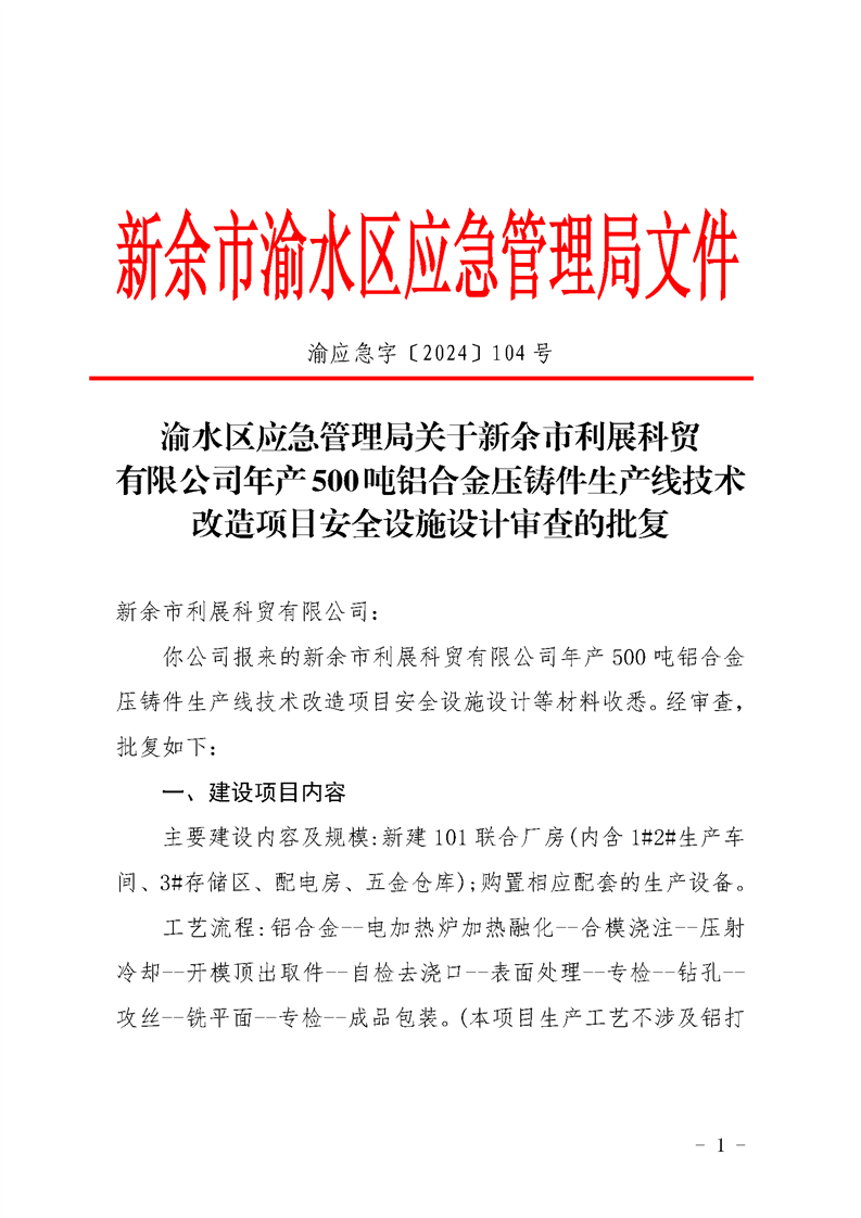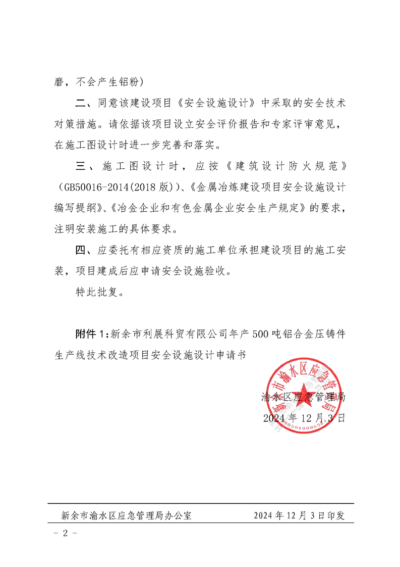 渝水區應急管理局關于新余市利展科貿有限公司年產500噸鋁合金壓鑄件生產線技術改造項目安全設施設計審查的批復