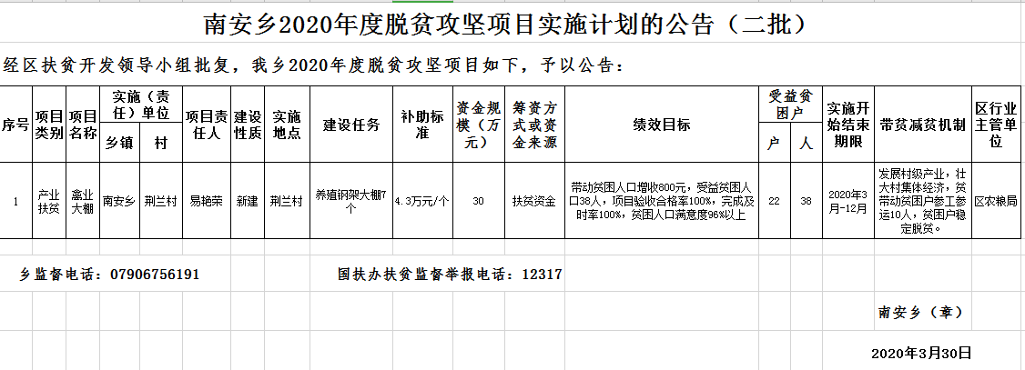 南安鄉(xiāng)2020年度脫貧攻堅(jiān)項(xiàng)目實(shí)施計(jì)劃的公告(二批)