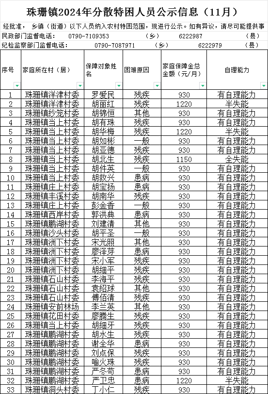 珠珊鎮2024年分散特困人員公示信息(11月)