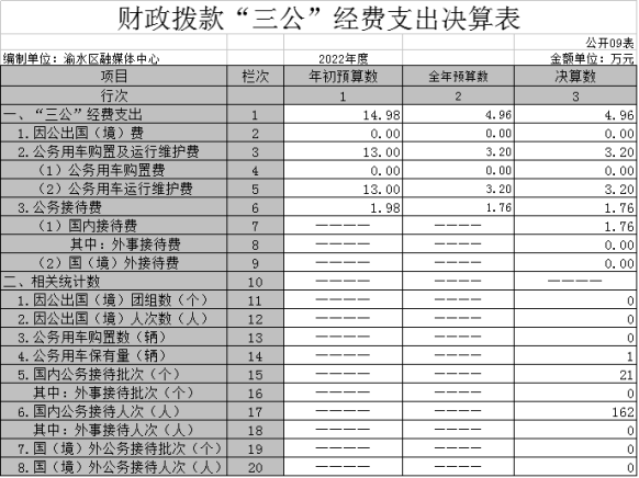 本單位2022年度財政撥款“三公”經費支出全年預算數為14.98萬元,決算數為4.96萬元,完成全年預算的33.11%,決算數較2021年減少1.57萬元,下降24.09%,其中: