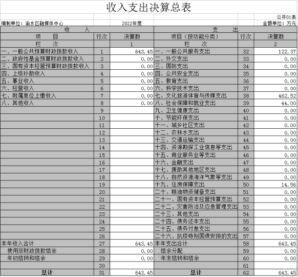 本單位2022年度收入總計643.45元,其中年初結轉和結余0萬元,較2021年減少15.09萬元,下降2.29%;本年收入合計643.45萬元,減少15.09萬元,下降2.29%,主要原因是:縮減經費。