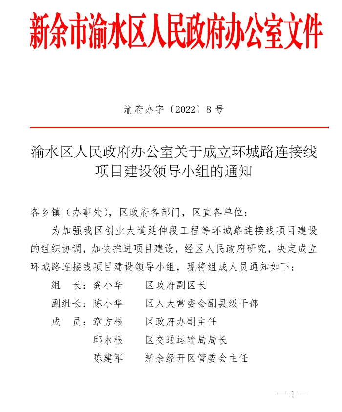 渝府辦字〔2022〕8號 渝水區人民政府辦公室關于成立環城路連接線項目建設領導小組的通知