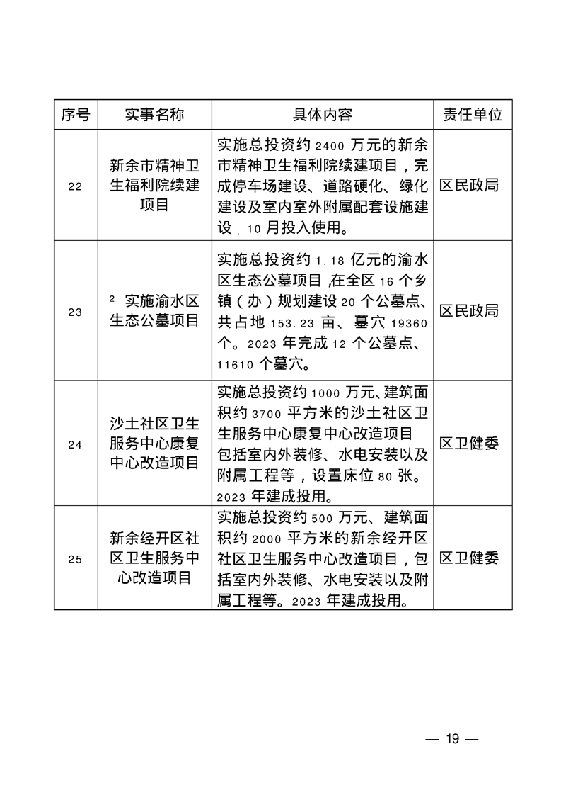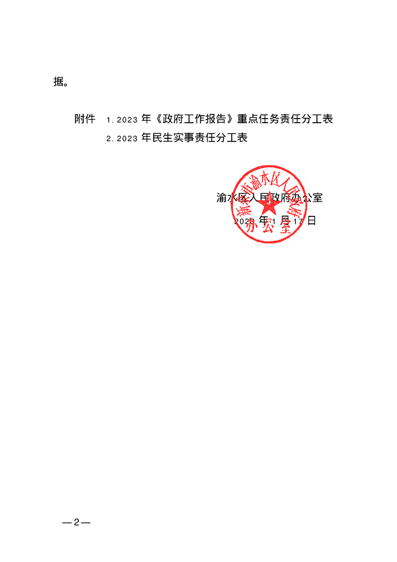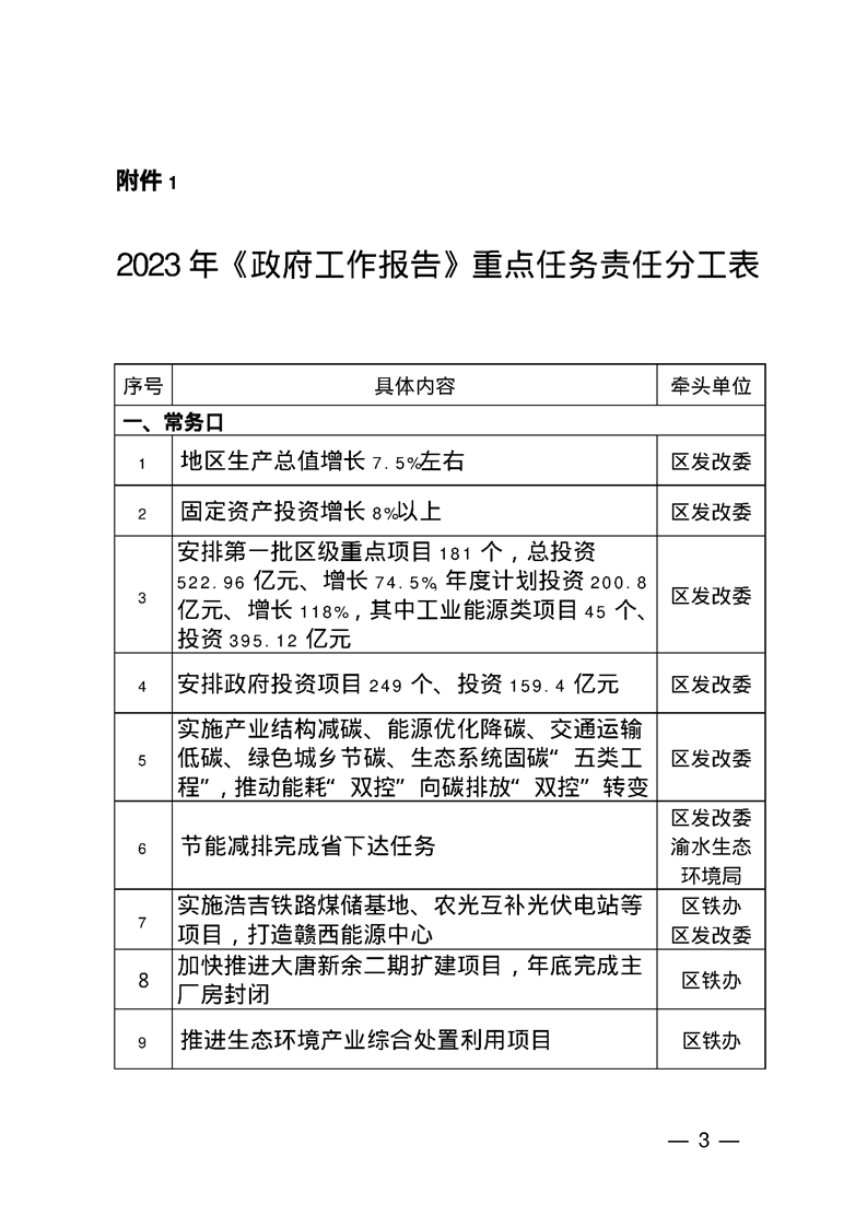 渝府辦字〔2023〕1號 渝水區人民政府辦公室關于印發2023年《政府工作報告》重點任務和民生實事責任分工的通知