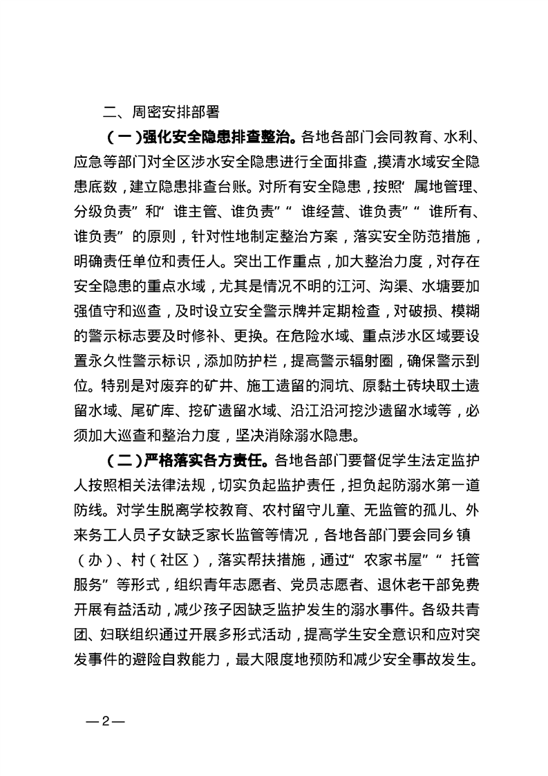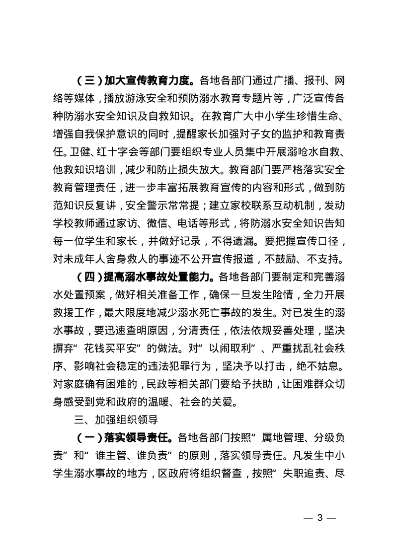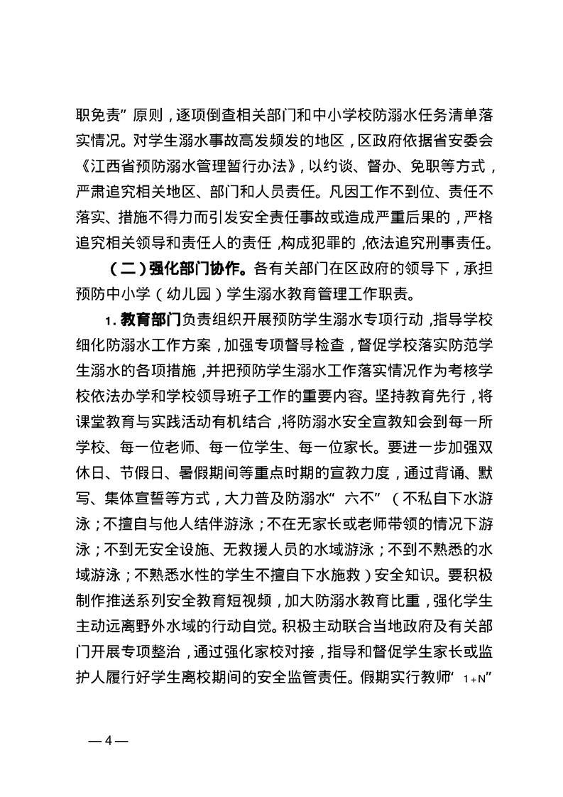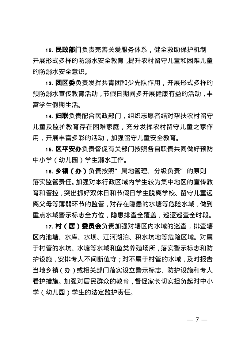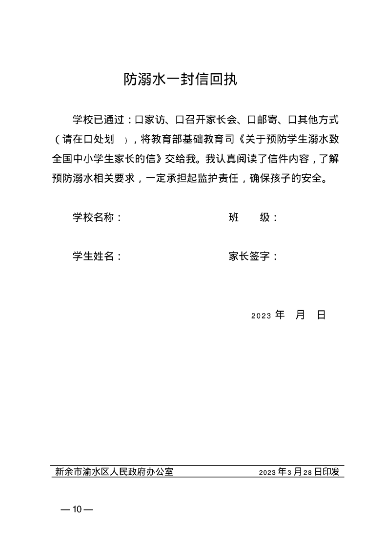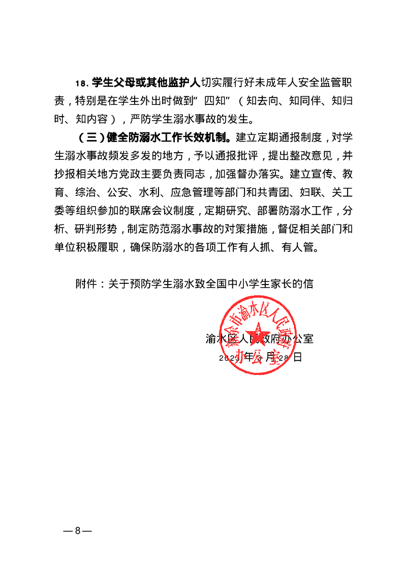 渝府辦字〔2023〕2號 渝水區人民政府辦公室關于進一步做好全區中小學(幼兒園)學生防溺水工作的通知