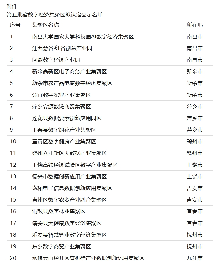 江西省發(fā)展改革委關(guān)于第五批省數(shù)字經(jīng)濟(jì)集聚區(qū)擬認(rèn)定名單的公示