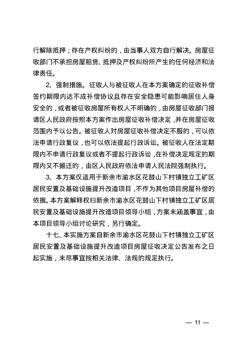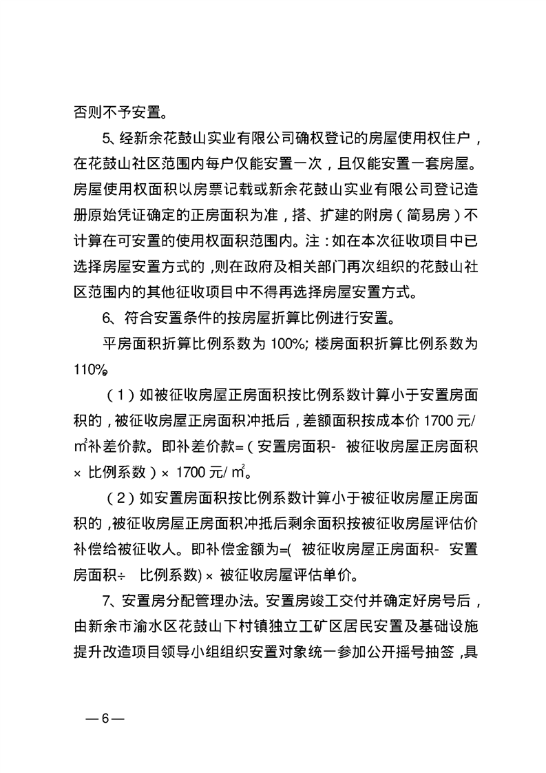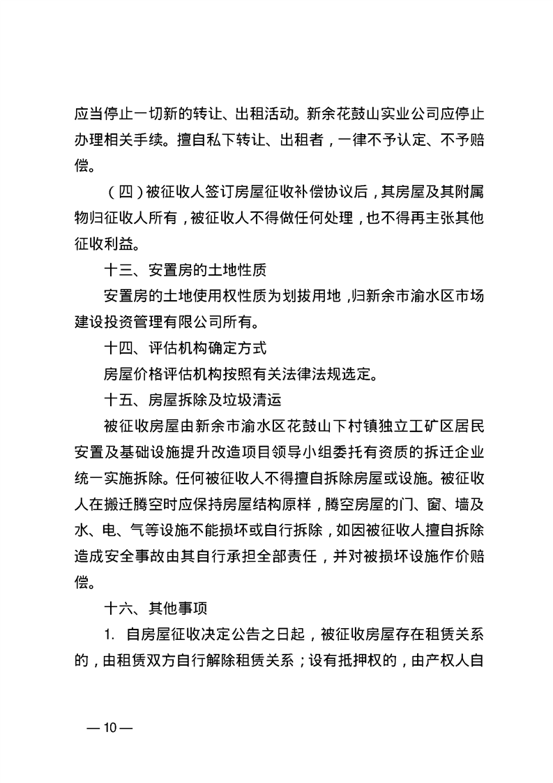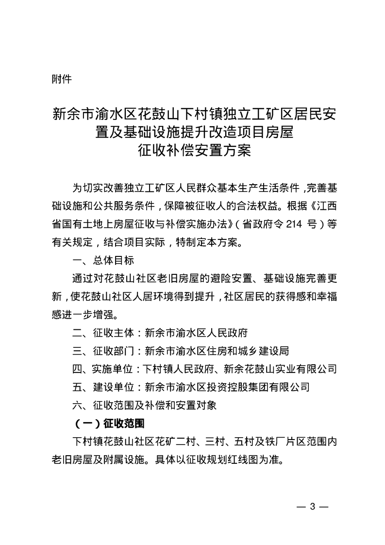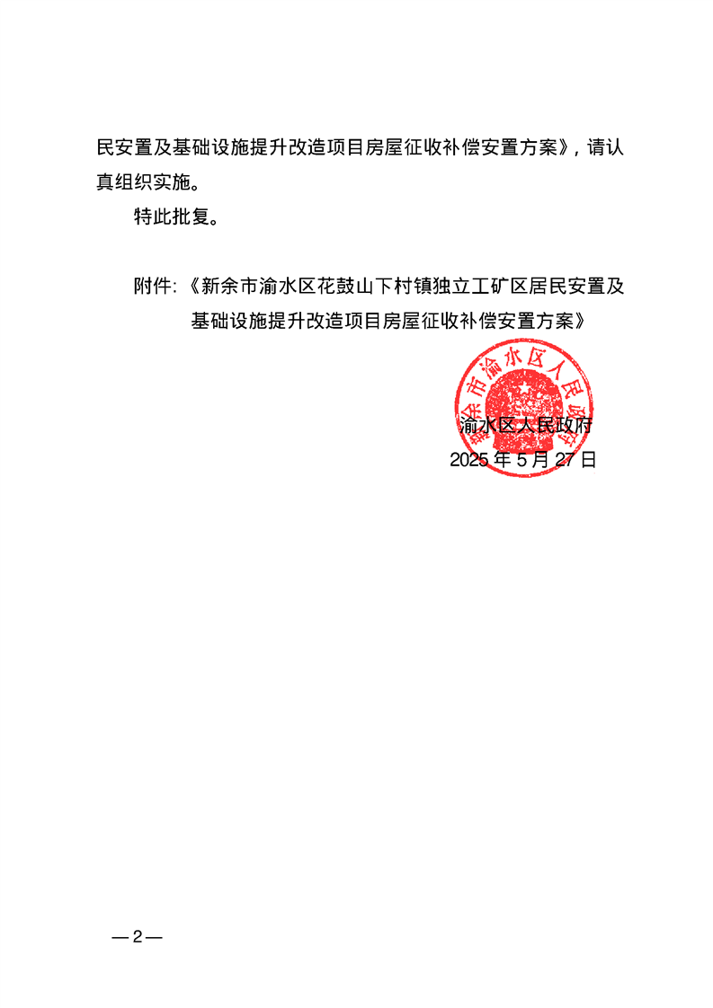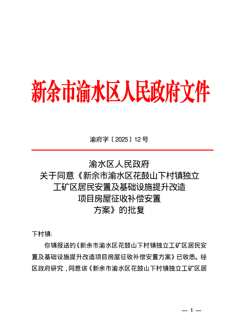 渝水區(qū)人民政府關(guān)于同意《新余市渝水區(qū)花鼓山下村鎮(zhèn)獨(dú)立工礦區(qū)居民安置及基礎(chǔ)設(shè)施提升改造項目房屋征收補(bǔ)償安置方案》的批復(fù)