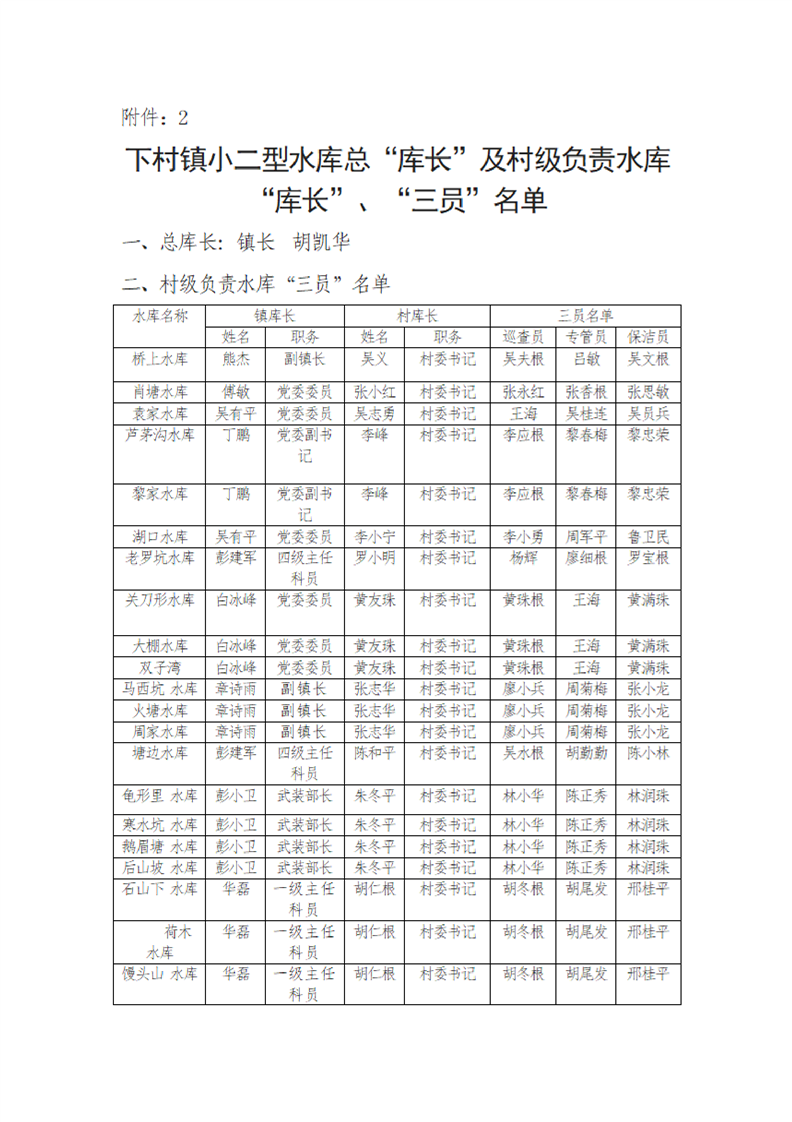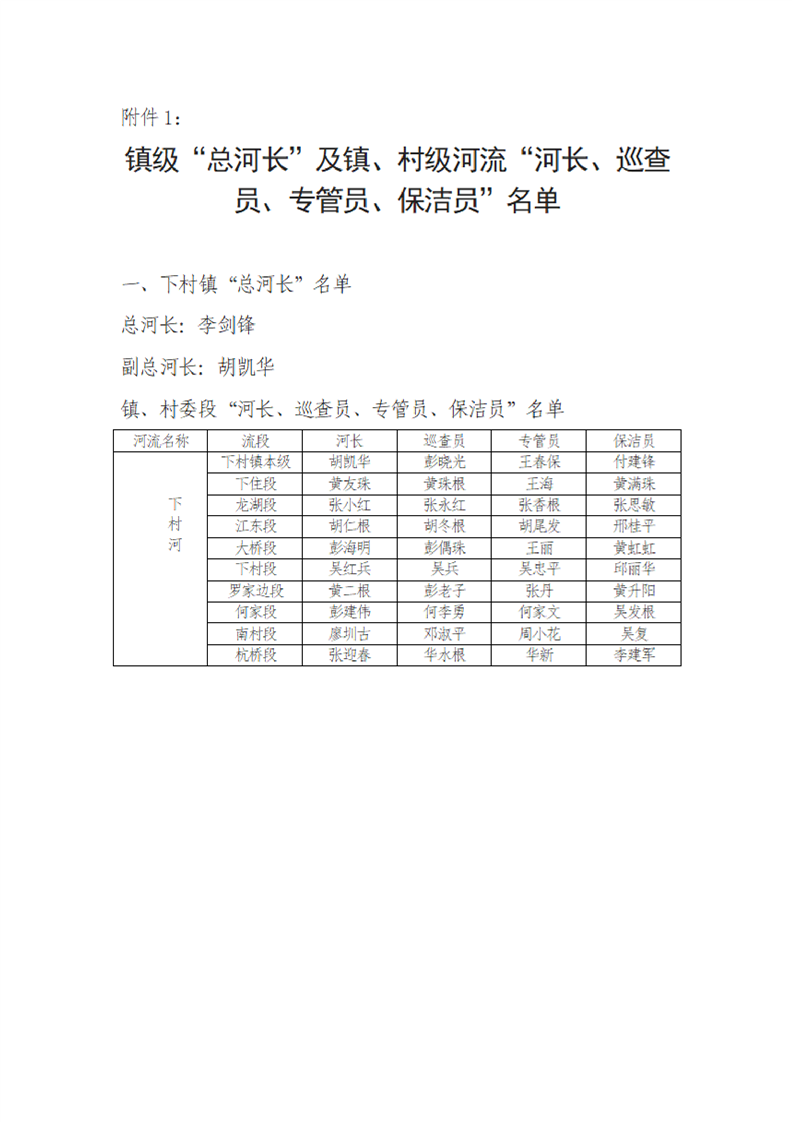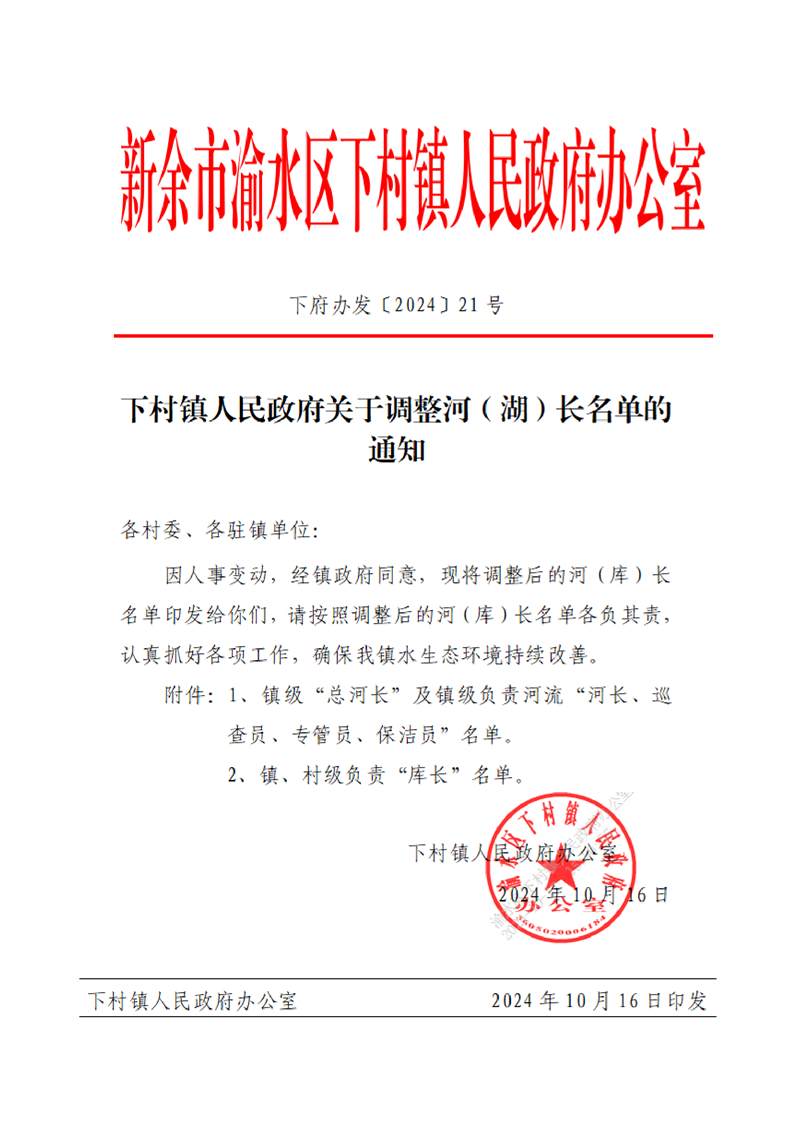 下府辦發〔2024〕21號下村鎮人民政府關于調整河(湖)長名單的通知(電子版)