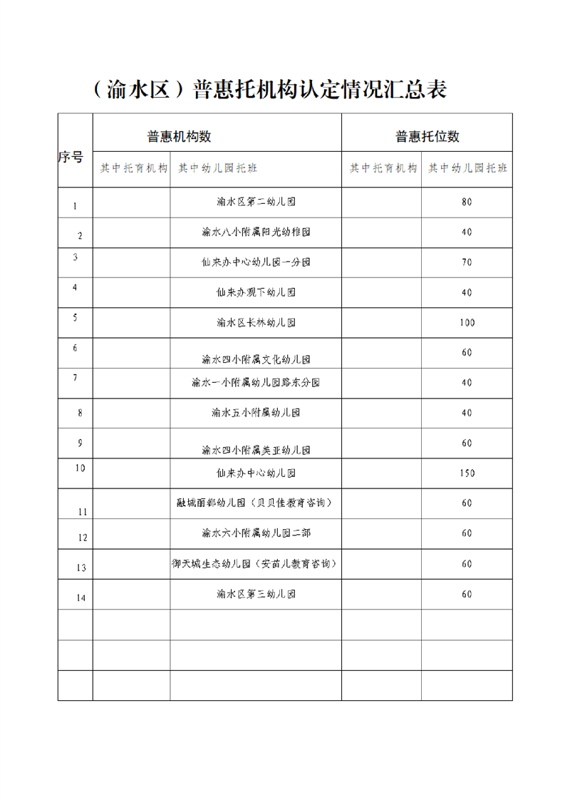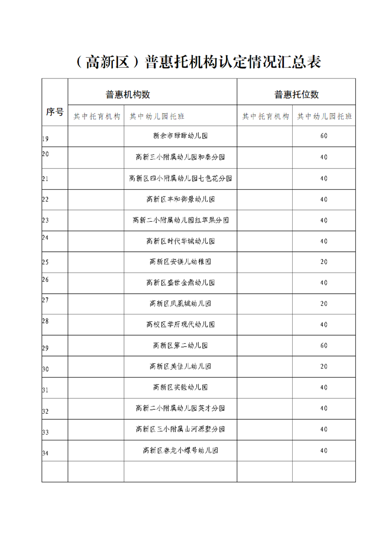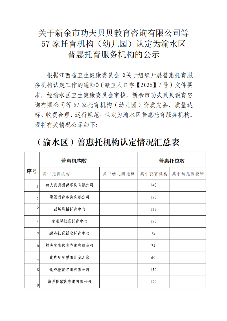 關于新余市功夫貝貝教育咨詢有限公司等57家托育機構(幼兒園)認定為渝水區普惠托育服務機構的公示
