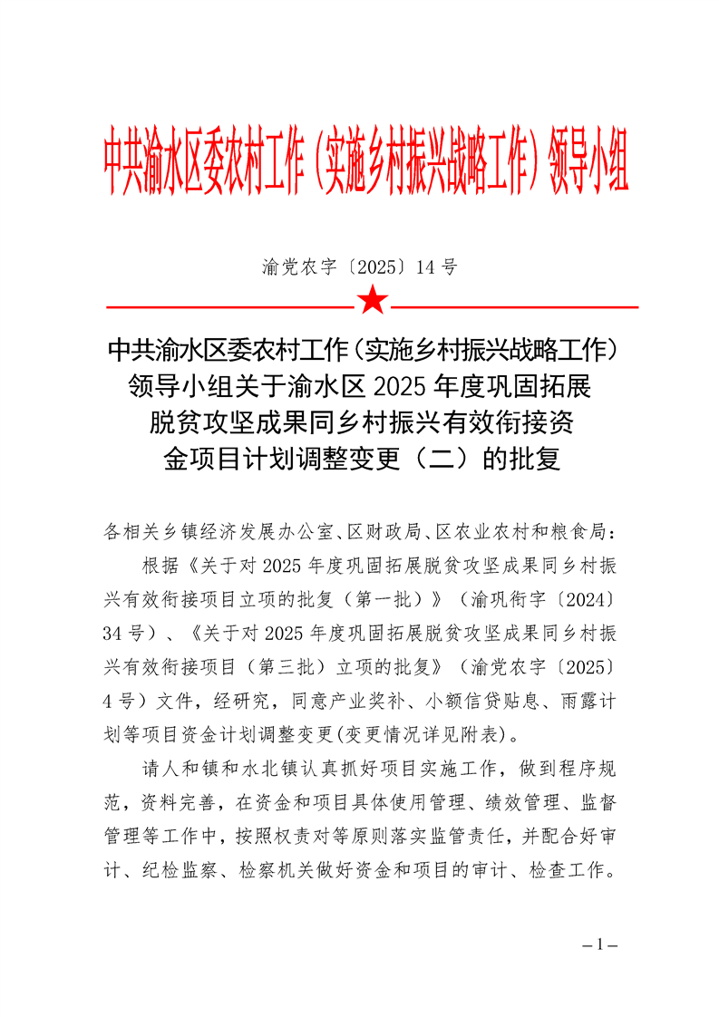 渝黨農字〔2025〕14號關于對2025年度鞏固拓展脫貧攻堅成果同鄉村振興有效銜接項目計劃調整變更(二)的批復