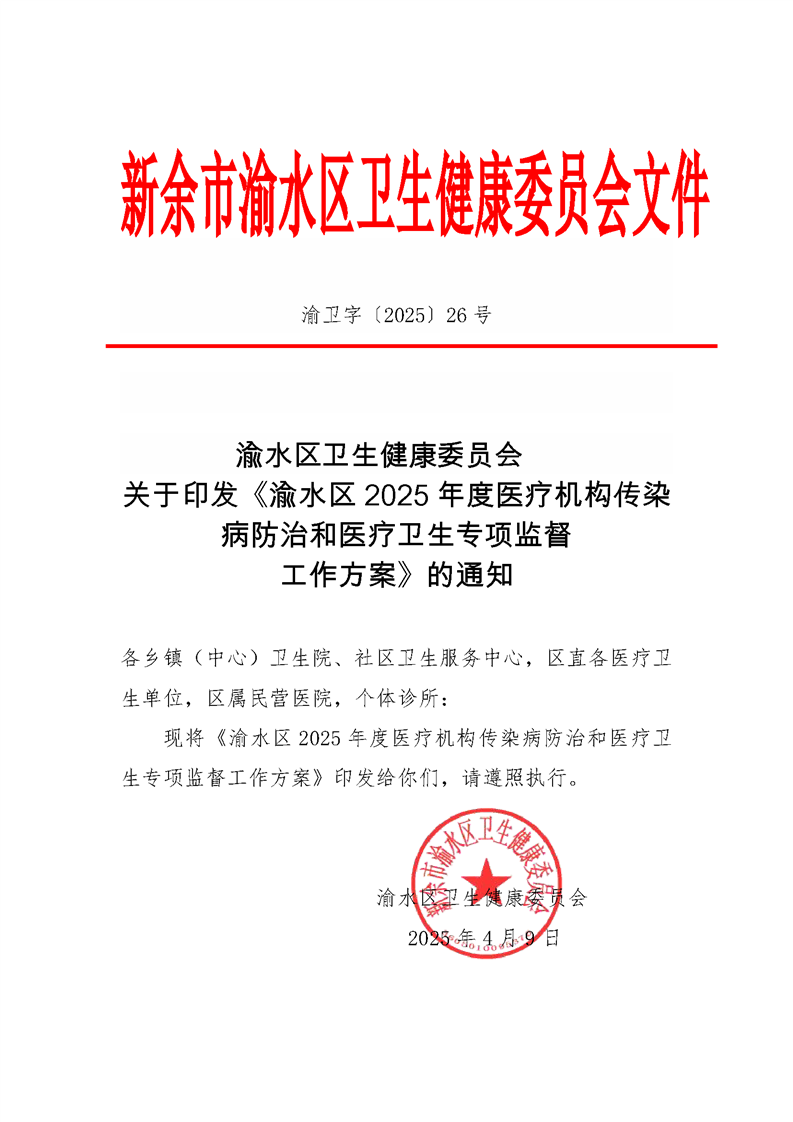 關(guān)于印發(fā)《渝水區(qū)2025年度醫(yī)療機構(gòu)傳染病防治和醫(yī)療衛(wèi)生專項監(jiān)督工作方案》的通知